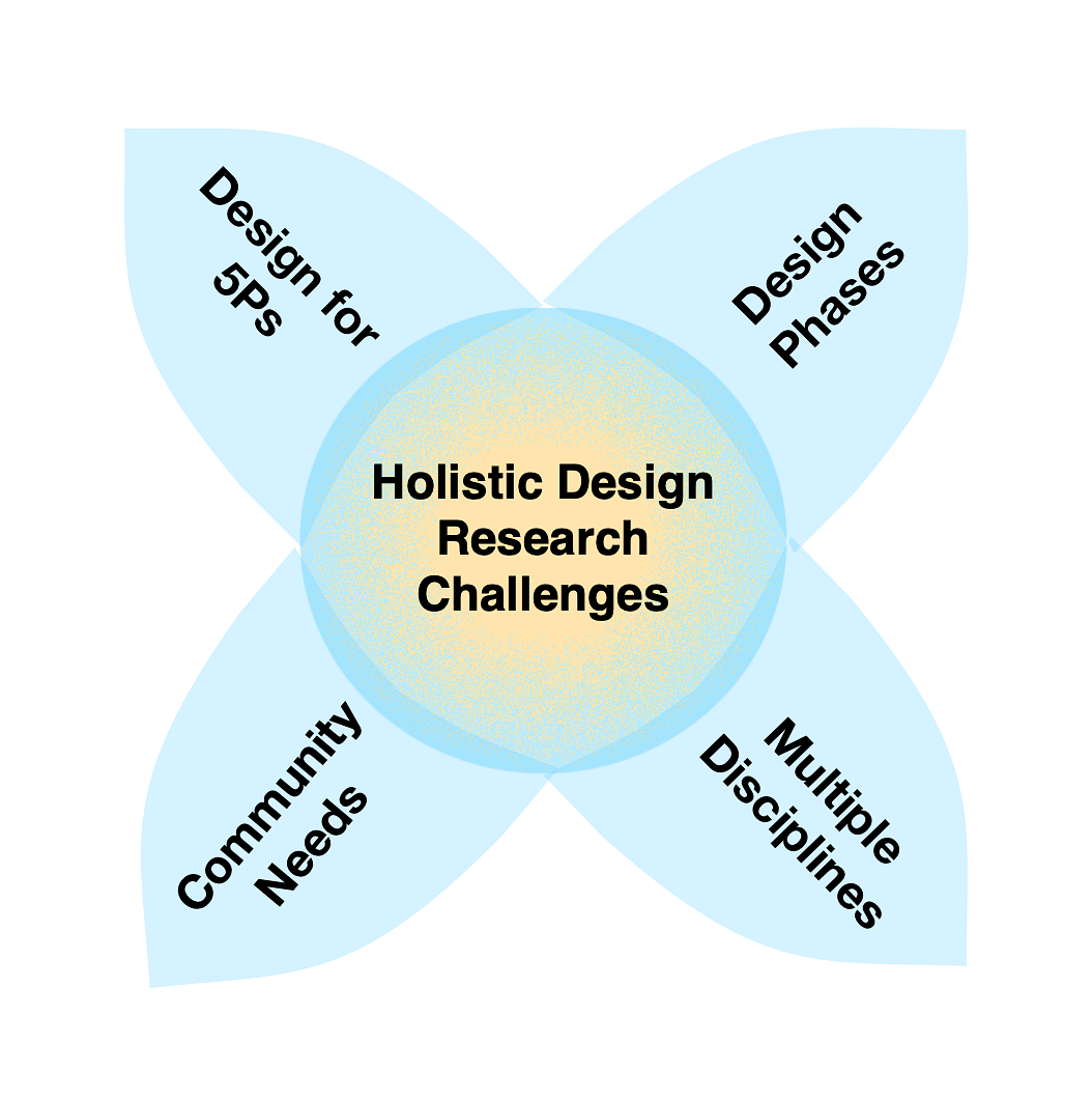 Our four-dimensional, transdisciplinary, convergent framework will help organize our research efforts, at the intersections of which we plan to tackle research problems in holistic design.